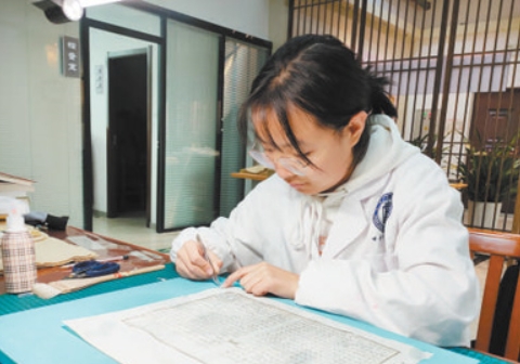 翻紙聲細微入耳,糨糊味清淡綿長……在占地350平方米的古籍修復室里,修復桌、白度儀、顯微鏡等專業設備一應俱全,17名修復師全神貫注。他們的一舉一動吸引著前來實踐的學生們?!案鼘I的設備、更豐富的古籍資源讓我躍躍欲試?!碧m州職業技術學院2020級學生安雅楠說。