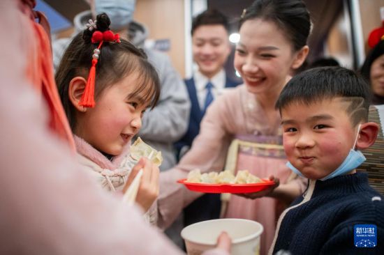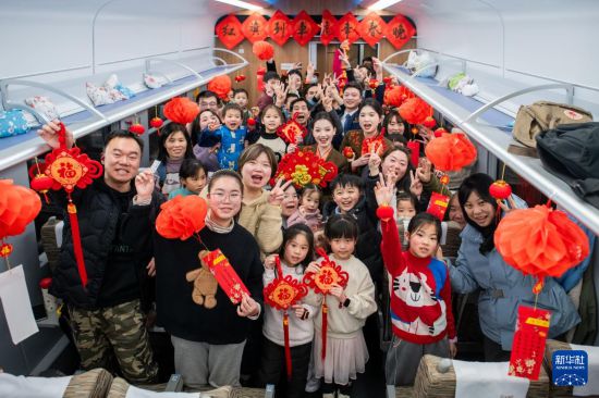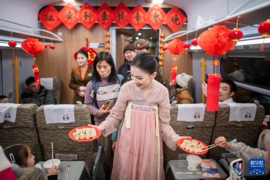 當日是除夕,武漢客運段漢口城際動車組車間“鳳舞楚天”乘務組在列車上布置燈籠、窗花,并為旅客發放“?!弊?、剪紙等禮物,大家一起吃餃子猜燈謎,度過了一個年味濃濃的除夕夜。