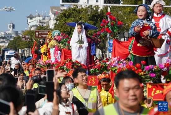 2月12日,在江西省婺源縣舉辦的“婺源非遺賀新春”巡游展演活動中,演員在進行巡游展演。