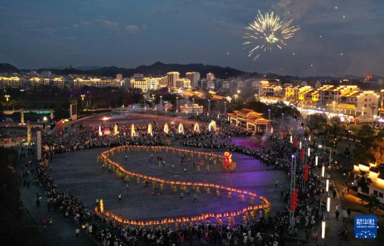 2月12日,在江西省婺源縣舉辦“婺源非遺賀新春”巡游展演活動中,演員進行板龍燈巡游展演(無人機照片,2月12日攝)。