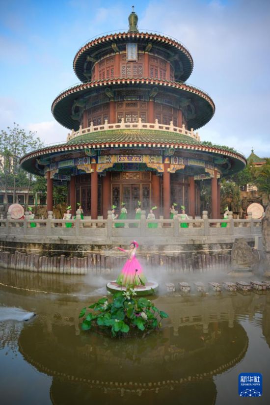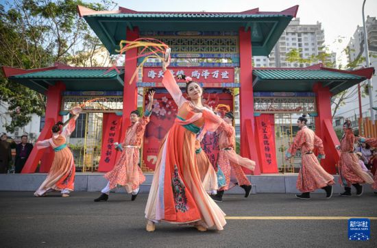 2月12日,在位于海南省??谑械牡谑鶎萌f春會分會場——海瑞文化公園春節系列活動中拍攝的舞蹈演藝現場。