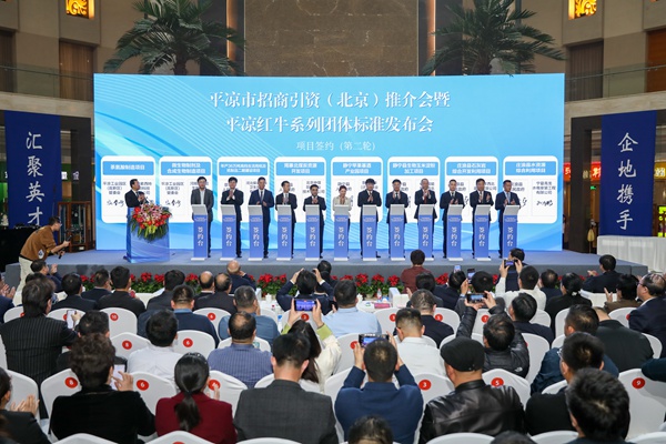 人民網蘭州3月15日電 (記者高翔)3月13日,平涼市招商引資(北京)推介會暨平涼紅牛系列團體標準發布會在北京舉行,現場共集中簽約項目96項,其中合同項目40項,簽約金額共計127.46億元;協議項目56項,簽約金額共計311.12億元。260多名行業專家、知名學者、企業家和業內人士齊聚一堂,共享發展機遇、共商合作大計,為推動平涼經濟社會高質量發展加力賦能。