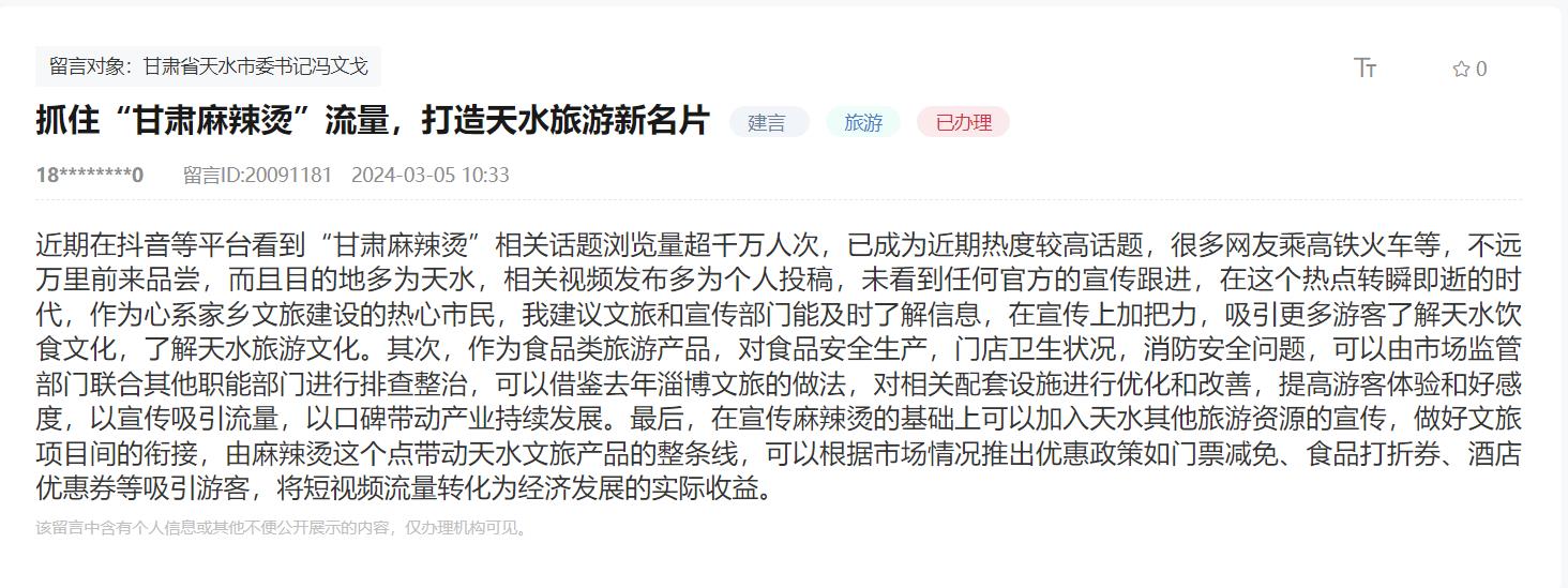 人民建議|網友建議借麻辣燙熱度打造文旅新名片 天水文旅:正在推進