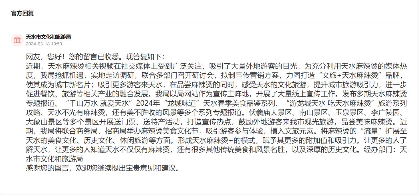 天水市文化和旅游局還在回復中表示,文旅局開展了大量線上宣傳工作,發布多個系列專題報道。伏羲廟大景區、南山景區、玉泉景區、李廣陵園、大象山景區等多個景區開展送門票和送特產活動,打造宣傳熱點,鼓勵外地游客來天水市觀光旅游、品嘗美味麻辣燙,將麻辣燙的“流量”擴展至天水的美食文化、歷史文化、休閑旅游等方面,形成“天水麻辣燙+”的模式,賦予其更多的附加值和吸引力。