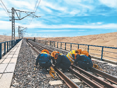 橋下,一群來沙漠里游玩的少年盡情拍照打卡,欣賞沙漠的美麗。橋上,記者爬到橋頂后,氣喘吁吁,而維修工區的職工們沒來得及喘一口氣,就投入到作業中。