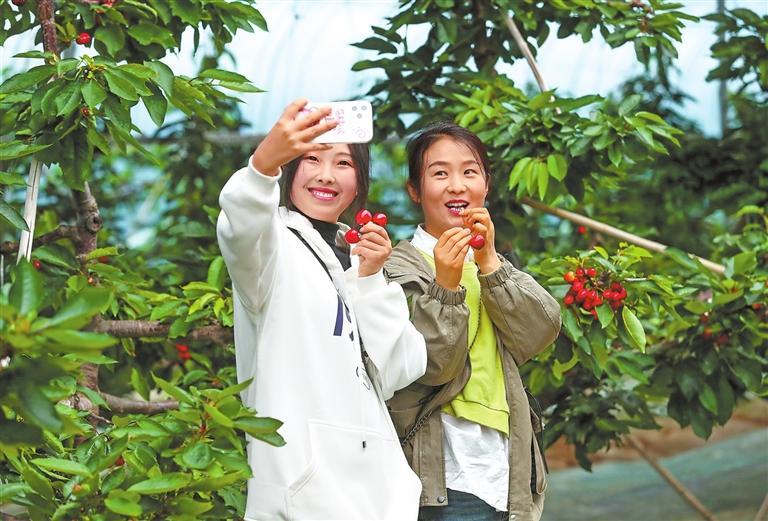 四月的天水市張家川縣,一片春和景明。位于張家川縣龍山鎮馬河村的裕豐果品專業合作社的溫室大棚內,一棵棵栽植整齊的櫻桃樹枝繁葉茂,長勢喜人,一枚枚紅瑪瑙般的大櫻桃掛在綠葉間,晶瑩剔透、嬌艷誘人,不時飄出陣陣甜香,讓人垂涎欲滴,引得游客紛至沓來,采摘品嘗,賞景拍照。