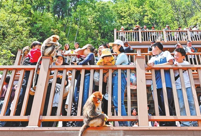 游客在隴南市武都區裕河鎮與川金絲猴親密接觸。新甘肅·甘肅日報記者 丁凱