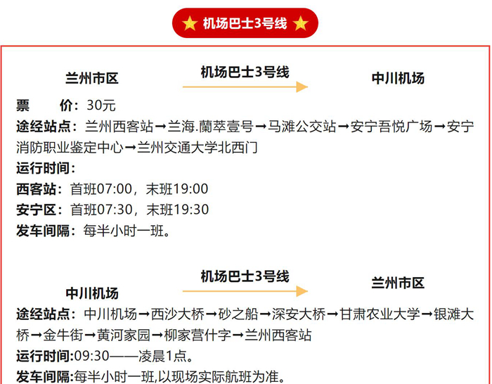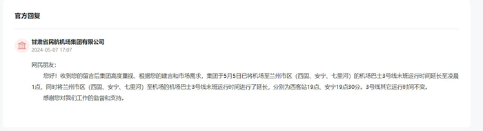 收到網友留言后,甘肅省民航機場集團有限公司高度重視,及時回復:“根據您的建言和市場需求,集團于5月5日已將機場至蘭州市區(西固、安寧、七里河)的機場巴士3號線末班運行時間延長至凌晨1點,同時將蘭州市區(西固、安寧、七里河)至機場的機場巴士3號線末班運行時間進行了延長,分別為西客站19點、安寧19點30分。3號線其它運行時間不變?!?/p>