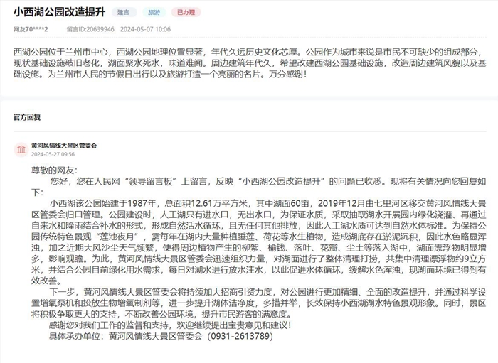黃河風情線大景區管委會對該留言作出回復:“小西湖公園始建于1987年,總面積12.61萬平方米,其中湖面60畝,2019年12月由七里河區移交黃河風情線大景區管委會歸口管理。公園建設時,人工湖只有進水口,無出水口,為保證水質,采取抽取湖水開展園內綠化澆灌、再通過自來水和降雨結合補水的形式,形成自然活水循環,且無任何其他排放,因此人工湖水質可達到自然水體標準。為保持公園傳統特色景觀‘蓮池夜月’,需每年在湖內大量種植睡蓮、荷花等水生植物,造成湖底存在淤泥沉積,因此水色略顯渾濁,加之近期大風沙塵天氣頻繁,使得周邊植物產生的柳絮、榆錢、落葉、花瓣、塵土等落入湖中,湖面漂浮物明顯增多,影響觀瞻。為此,黃河風情線大景區管委會迅速組織力量,對湖面進行了整體清理打撈,共集中清理漂浮物約9立方米,并結合公園目前綠化用水需求,每日對湖水進行放水注水,以此促進水體循環,緩解水色渾濁,現湖面環境已得到有效改善?!?/p>