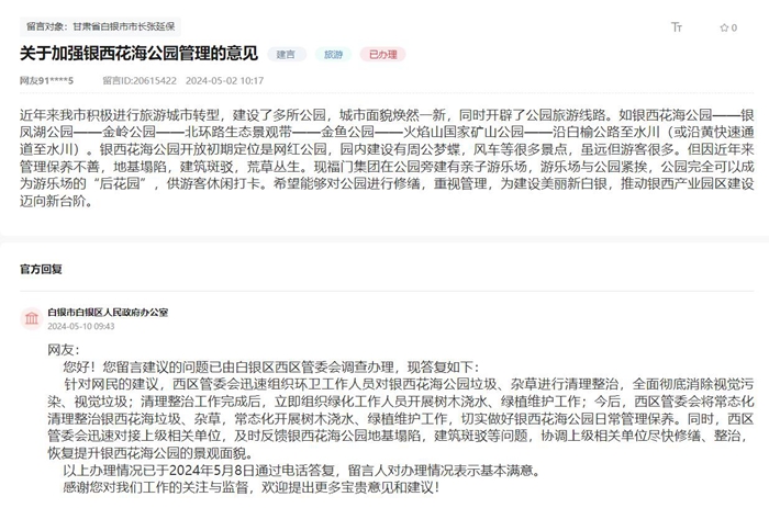 白銀市白銀區人民政府辦公室積極作出回復:“留言建議的問題已由白銀區西區管委會調查辦理,針對建議,西區管委會迅速組織環衛工作人員對銀西花海公園垃圾、雜草進行清理整治,全面徹底消除視覺污染、視覺垃圾。清理整治工作完成后,立即組織綠化工作人員開展樹木澆水、綠植維護工作。今后,西區管委會將常態化清理整治銀西花海垃圾、雜草,常態化開展樹木澆水、綠植維護工作,切實做好銀西花海公園日常管理保養。同時,西區管委會迅速對接上級相關單位,及時反饋銀西花海公園地基塌陷、建筑斑駁等問題,協調上級相關單位盡快修繕、整治,恢復提升銀西花海公園的景觀面貌?!?/p>