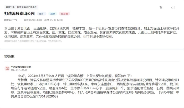 中共定西市委辦公室回復表示,漳縣文體旅游局已初步謀劃了總投資8000萬元的漳縣鐘鼓旗山公園旅游基礎設施建設項目,計劃建設旗山堡1處、恢復重建泰山書院1000平方米、鐘山重建鐘樓1座,中峰東連董家莊、西接楊家寺洪溝段的健身步道5公里,提升山地自行車運動道路5公里,建設涼亭6處、生態停車場800平方米、旅游廁所5個,沿步道配套垃圾桶、石凳、圓凳及休憩、觀景平臺等設施。項目已提交縣林草中心,列入《漳縣泰山省級森林公園總體規劃》后將組織實施。