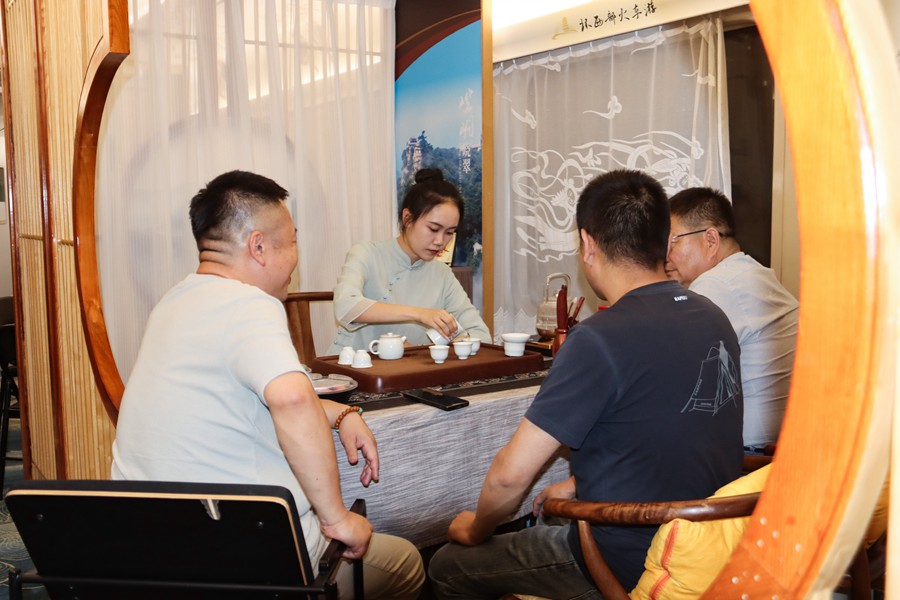 游客在“環西部火車游”列車上體驗茶道。蘭州鐵路局供圖