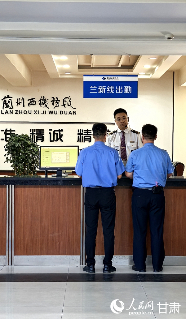 8月19日上午,采訪團隊來到蘭州西機務段調車車間派班室大廳,圖為以情景表演劇形式展現的出勤調度員向出勤機班傳達班前注意事項工作環節。人民網記者 邵蘭攝