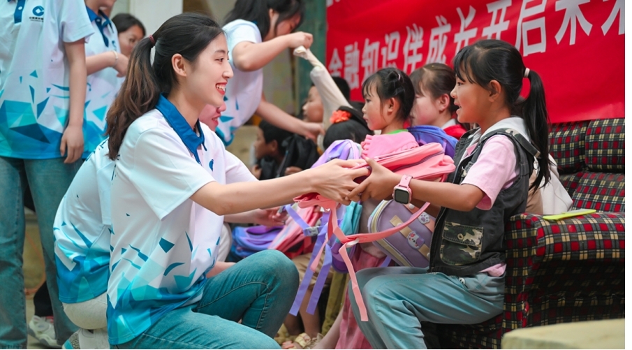建設銀行定西分行實習生為孩子們贈送新書包。楊藝鍇攝
