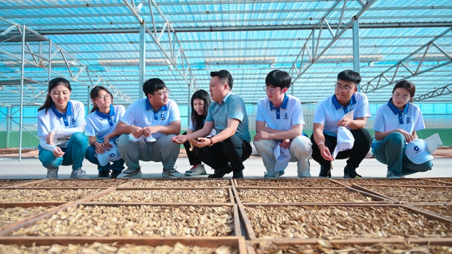 岷縣御歸堂中藥材有限公司總經理郭偉(右四)向建行實習生們講解當歸加工流程。楊藝鍇攝