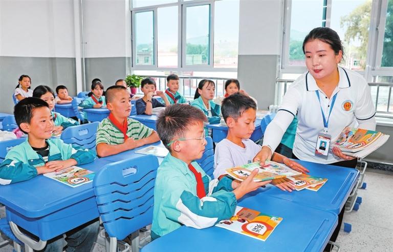 積石山縣大河家鎮五一小學老師給學生分發新書。
