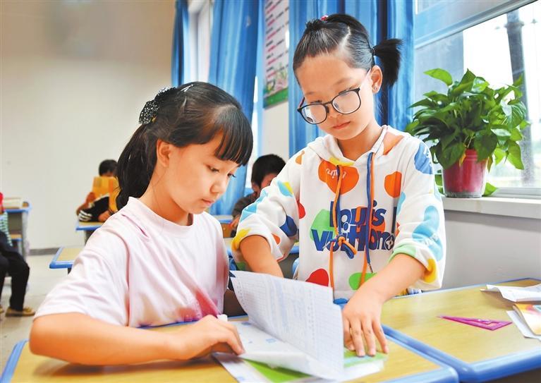 積石山縣大河家鎮五一小學的孩子正在包書皮。