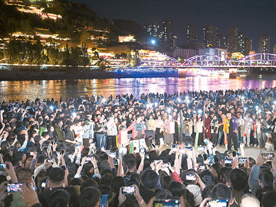 在黃河蘭州段近水平臺,市民及游客參與蘭州黃河大合唱活動。新華社記者 范培珅攝