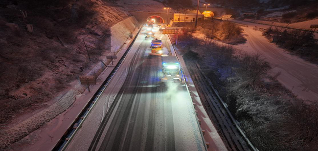 24日凌晨,G75蘭海高速蘭臨段、G30連霍高速永古段等線路路面出現積雪。蘭州高速公路養護所立即采取應對措施,堅持“邊下邊清、人歇機不歇”的原則,兵分多路連夜開展打冰除雪工作,對易結冰重點路段按照先除雪車梯隊作業再撒布車撒融雪劑的作業方式進行精細除雪;在主要路段設置安全警示標志,提示過往車輛緩慢通行;在隧道進出口撒布防滑料,防止車輛打滑。