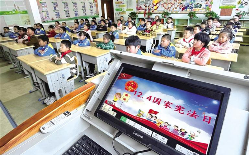 圖為蘭州新區第二小學在國家憲法日暨“憲法宣傳周”活動啟動當天開展“憲法晨讀”活動。