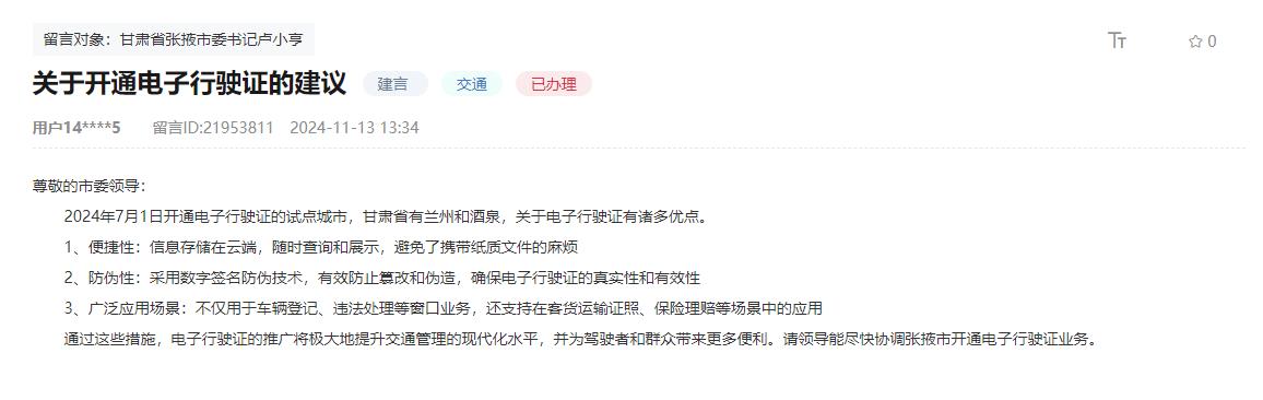 該網友在留言中提到,2024年7月1日開通電子行駛證的試點城市中,甘肅省有蘭州市和酒泉市,希望能協調張掖市開通電子行駛證業務。