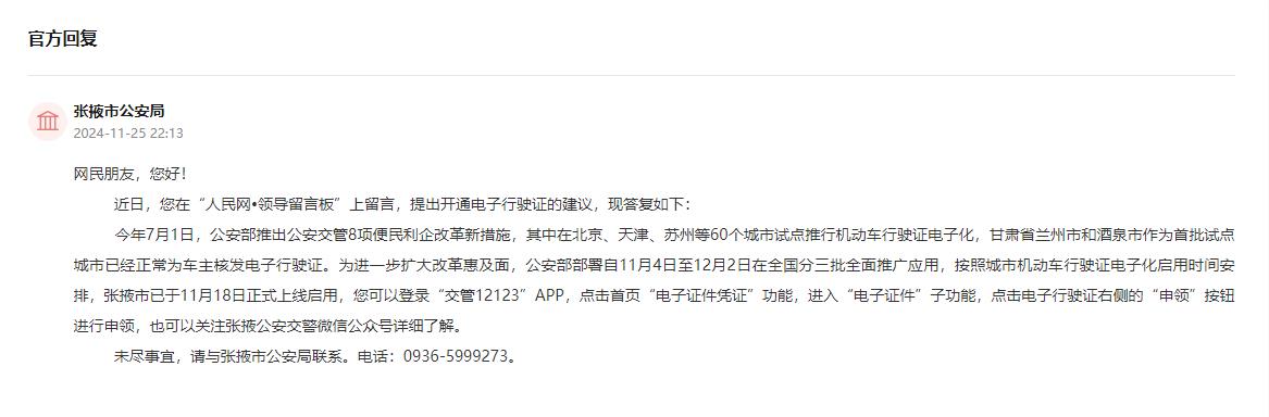 收到網友留言后,張掖市公安局進行了詳細回復:今年7月1日,公安部推出公安交管8項便民利企改革新措施,其中在北京、天津、蘇州等60個城市試點推行機動車行駛證電子化,甘肅省蘭州市和酒泉市作為首批試點城市已經正常為車主核發電子行駛證。為進一步擴大改革惠及面,公安部部署自11月4日至12月2日在全國分三批全面推廣應用,按照城市機動車行駛證電子化啟用時間安排,張掖市已于11月18日正式上線啟用,可以登錄“交管12123”APP,點擊首頁“電子證件憑證”功能,進入“電子證件”子功能,點擊電子行駛證右側的“申領”按鈕進行申領,也可以關注張掖公安交警微信公眾號詳細了解。