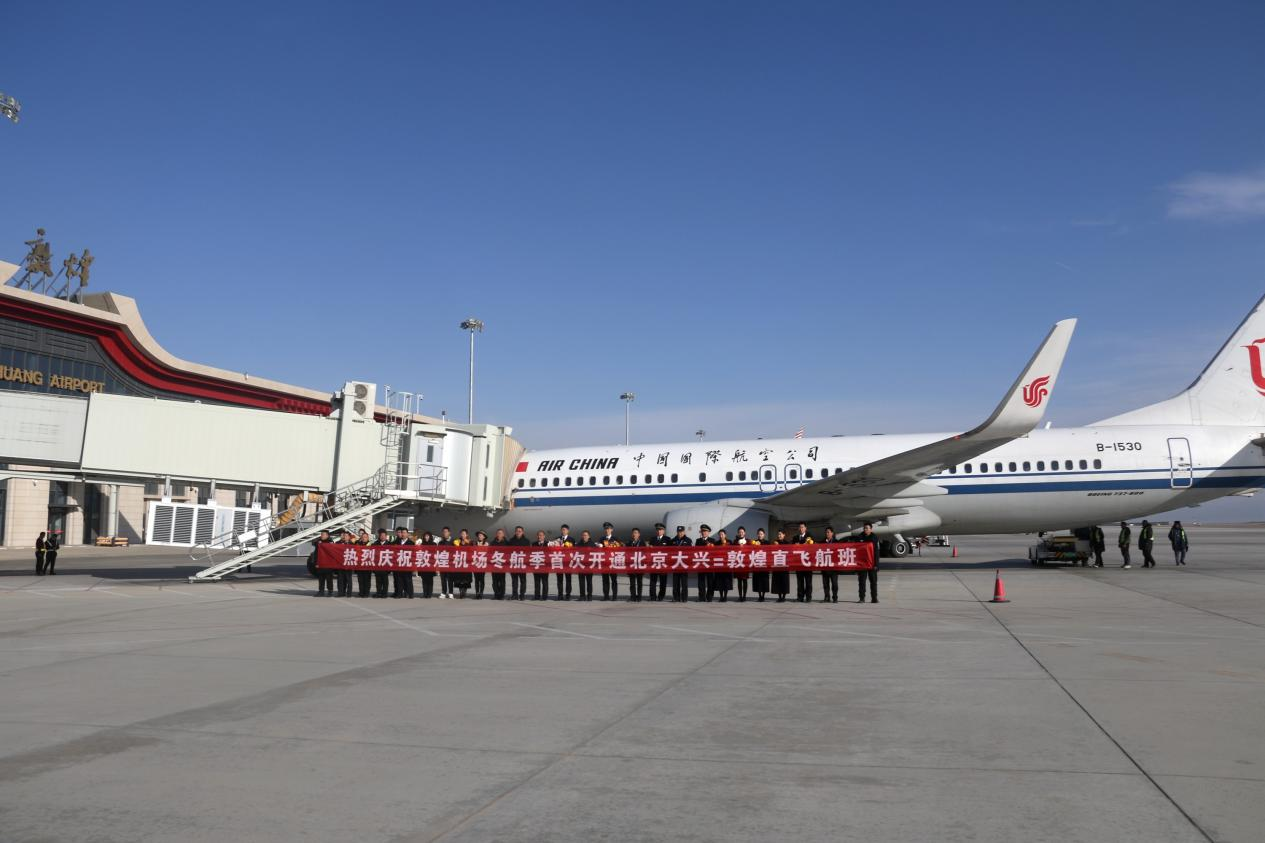 1月2日,由中國國際航空執飛的北京大興至敦煌直飛航班降落甘肅敦煌莫高國際機場,該航班每周二、四、六執行。這是冬航季首次開通北京大興至敦煌直飛航班,為旅客出行搭建起了便捷的空中橋梁,也為敦煌冬季旅游發展增添了新動能。(張曉亮 郝志晨)