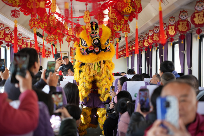 列車緩緩前行,窗外風景變換?!奥疖嚒背蔀榱藗鬟f新春祝福和非遺保護傳承的流動載體,它也讓每一位旅客帶著滿滿的幸福感和歸屬感奔赴團圓。