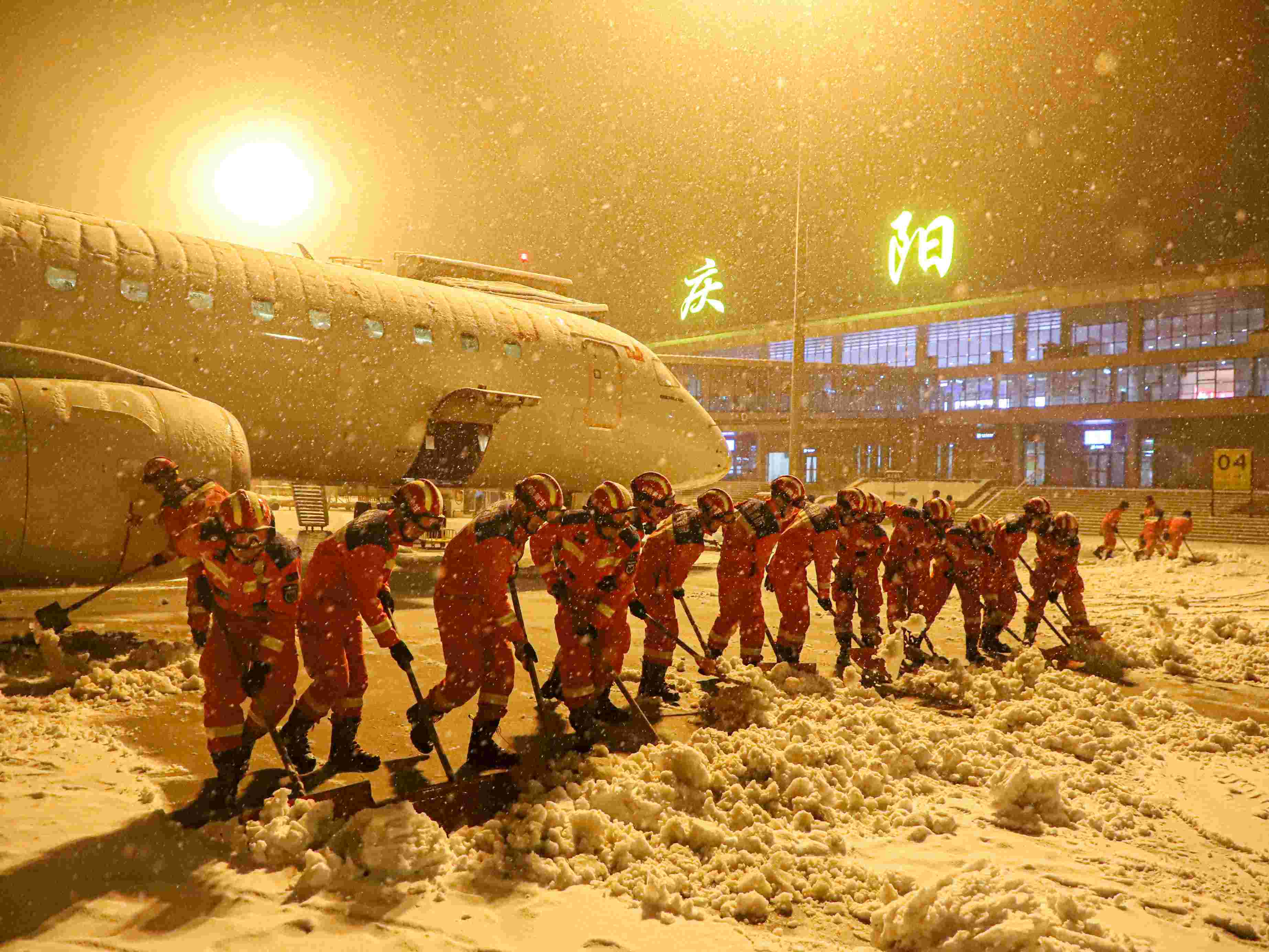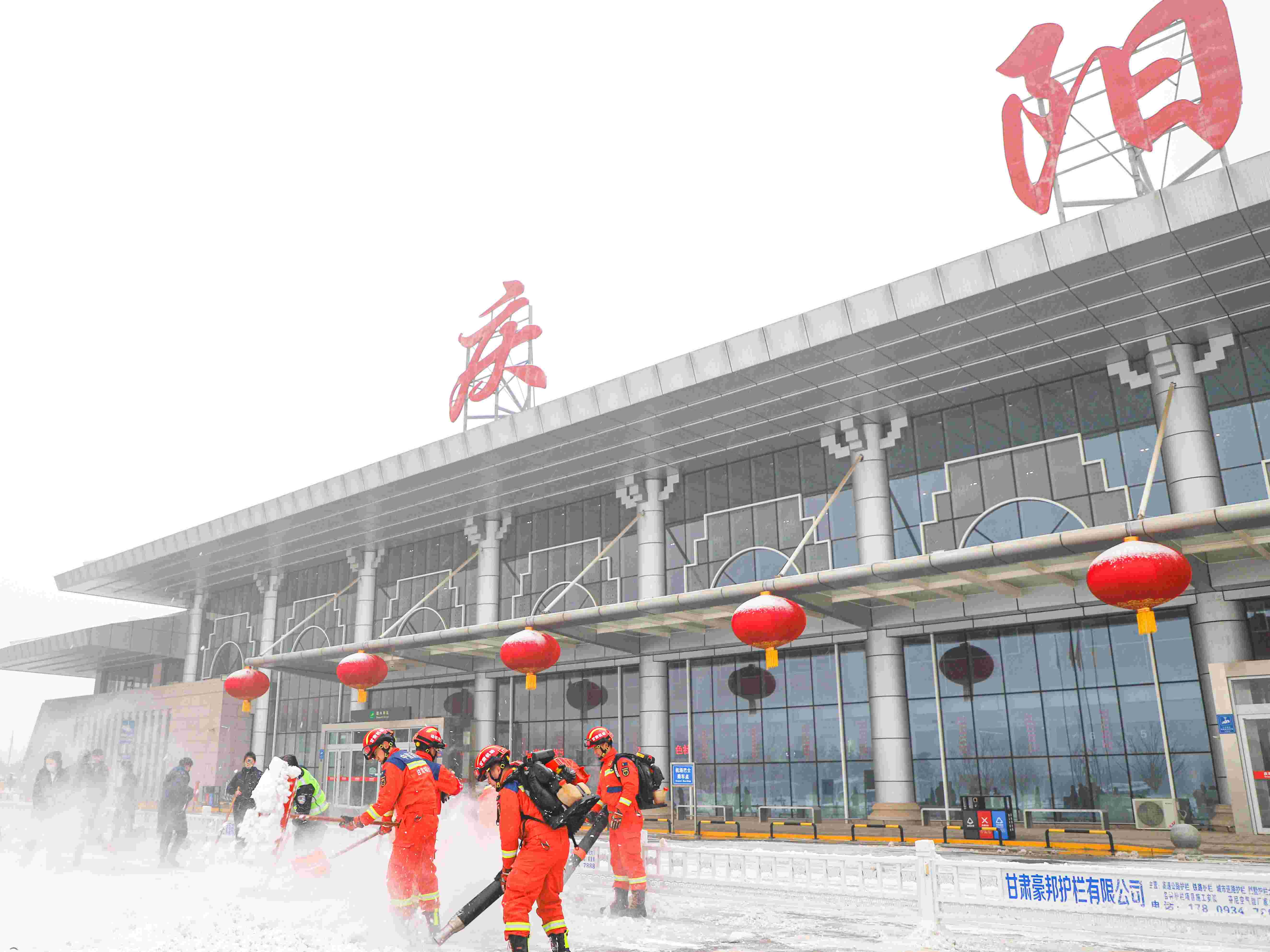 1月24日,甘肅森林消防總隊慶陽大隊在慶陽機場航站樓外與機場工作人員清除積雪。甘肅森林消防總隊供圖