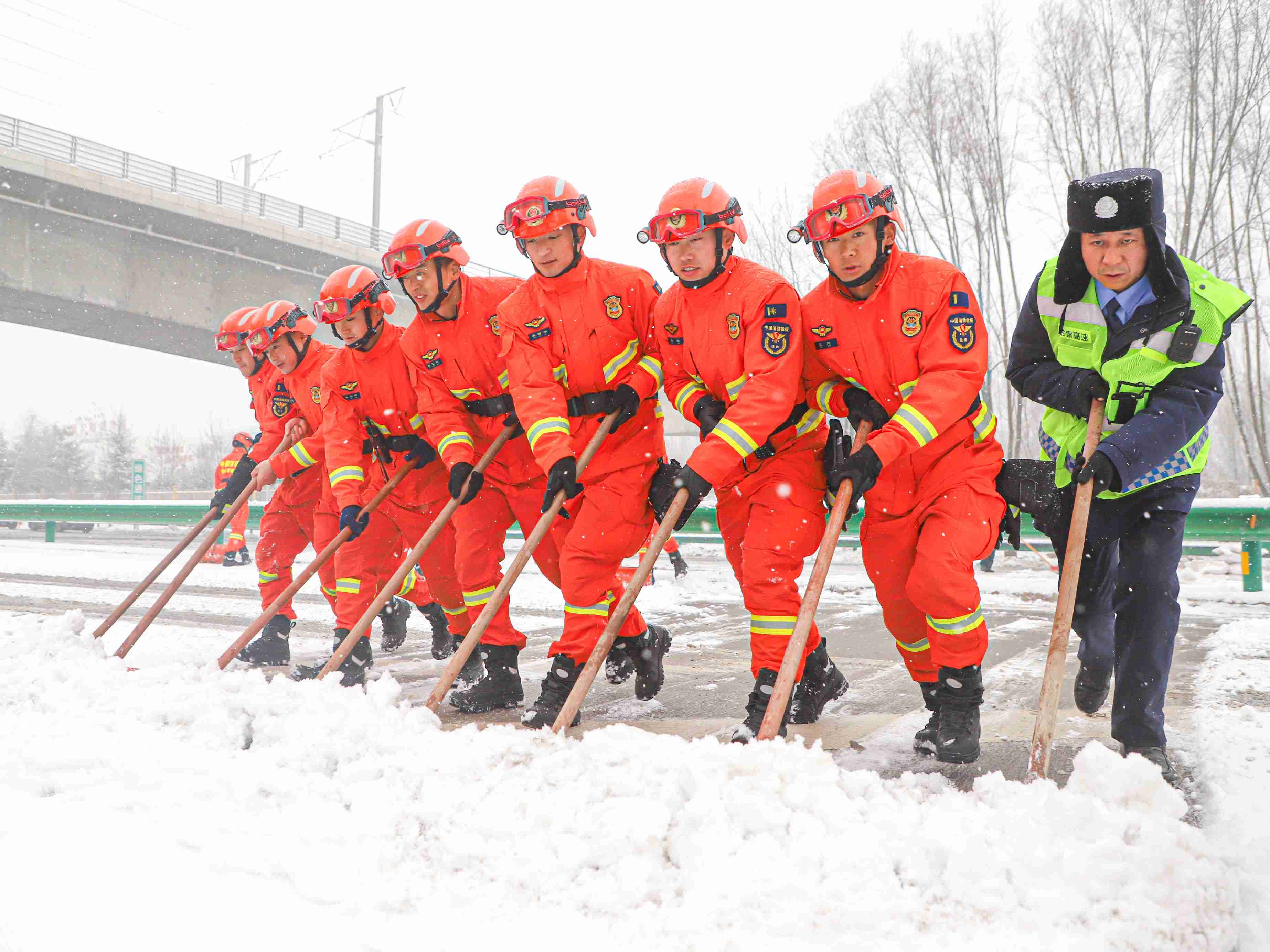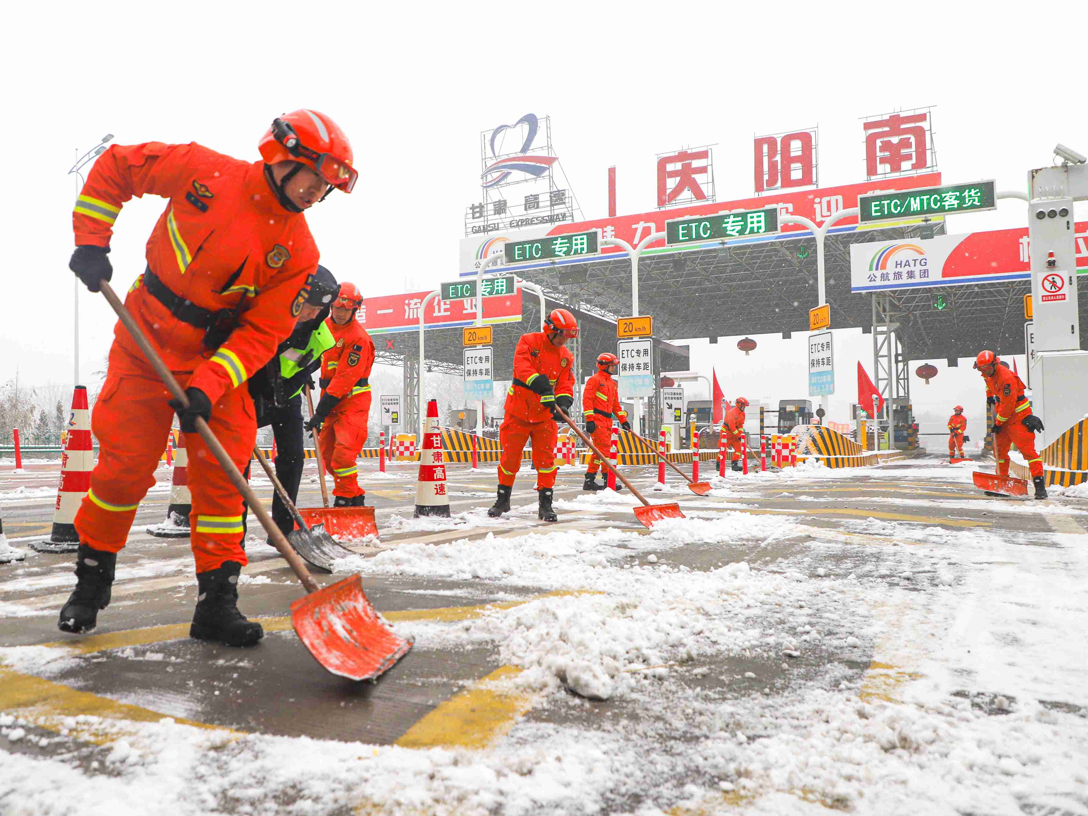 1月24日,甘肅森林消防總隊慶陽大隊在慶陽南高速路口與工作人員清除積雪。甘肅森林消防總隊供圖