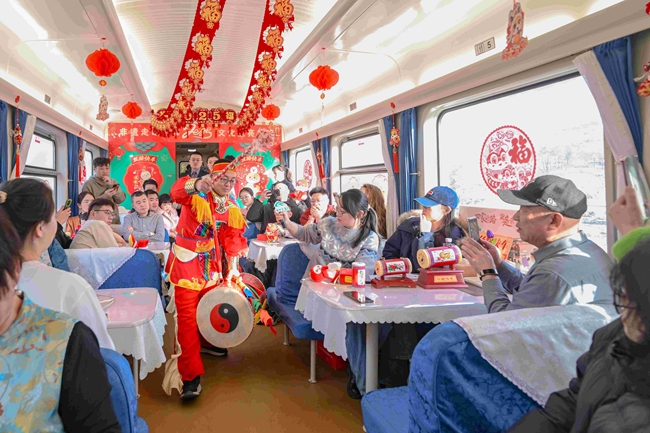 熱騰騰的餃子讓跨年列車的車廂年味更濃,在歌聲、鼓聲、歡笑聲中,天南海北的人們相聚在列車,同賀新春、共享年味。