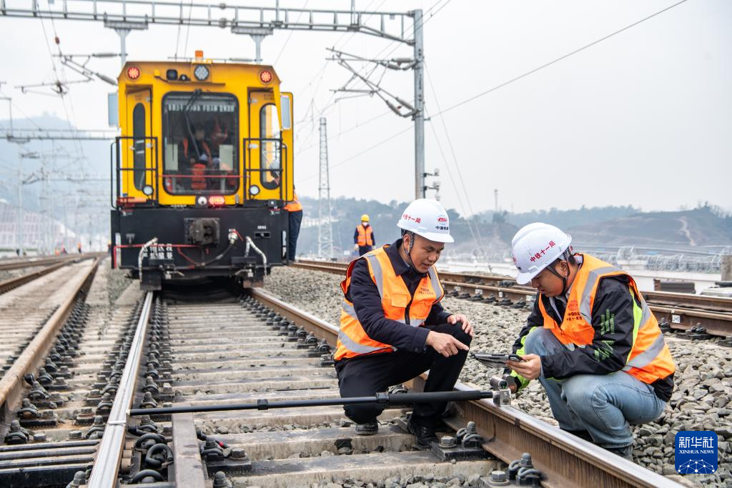 2月18日,在重慶東站建設施工現場,鐵路工人在對線路進行精調作業。