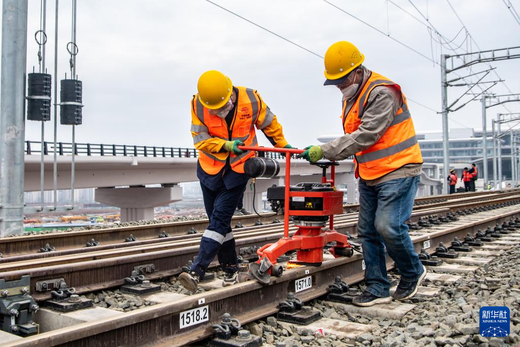 2月18日,在重慶東站建設施工現場,鐵路工人在對線路進行精調作業。