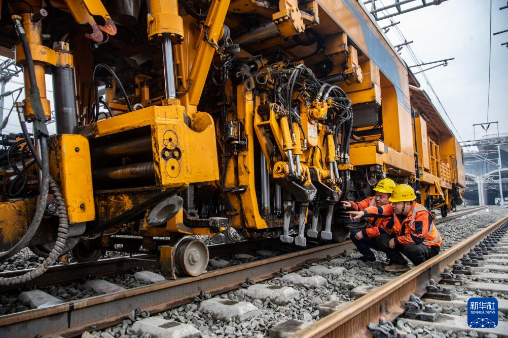 2月18日,在重慶東站建設施工現場,中鐵十一局的鐵路工人對大機搗固車進行檢查。