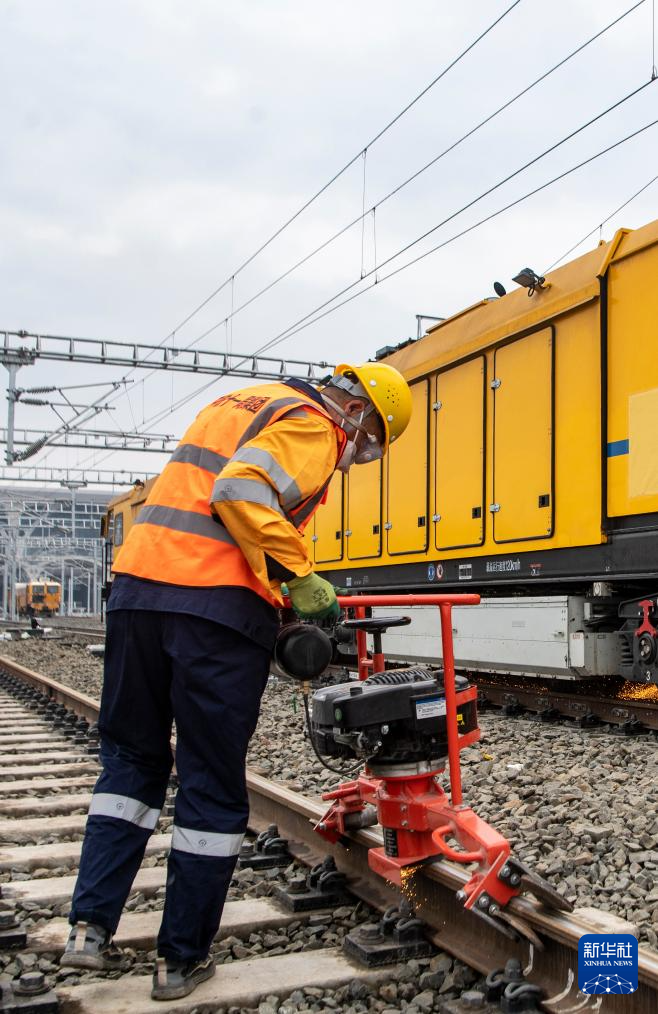 2月18日,在重慶東站建設施工現場,鐵路工人在對線路進行精調作業。