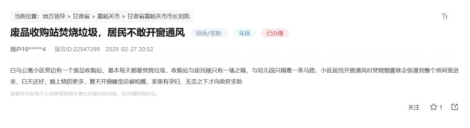 人民網蘭州3月28日電 (記者黃帆)近日,甘肅省嘉峪關市的網友在領導留言板反映急難愁盼問題:“白馬公寓小區旁邊有一個廢品收購站,基本每天都要焚燒垃圾,收購站與居民樓只有一墻之隔,與幼兒園只隔著一條馬路,小區居民開窗通風時焚燒煙霧就會彌漫到整個房間里來,夏天開窗睡覺總被嗆醒?!?/p>
