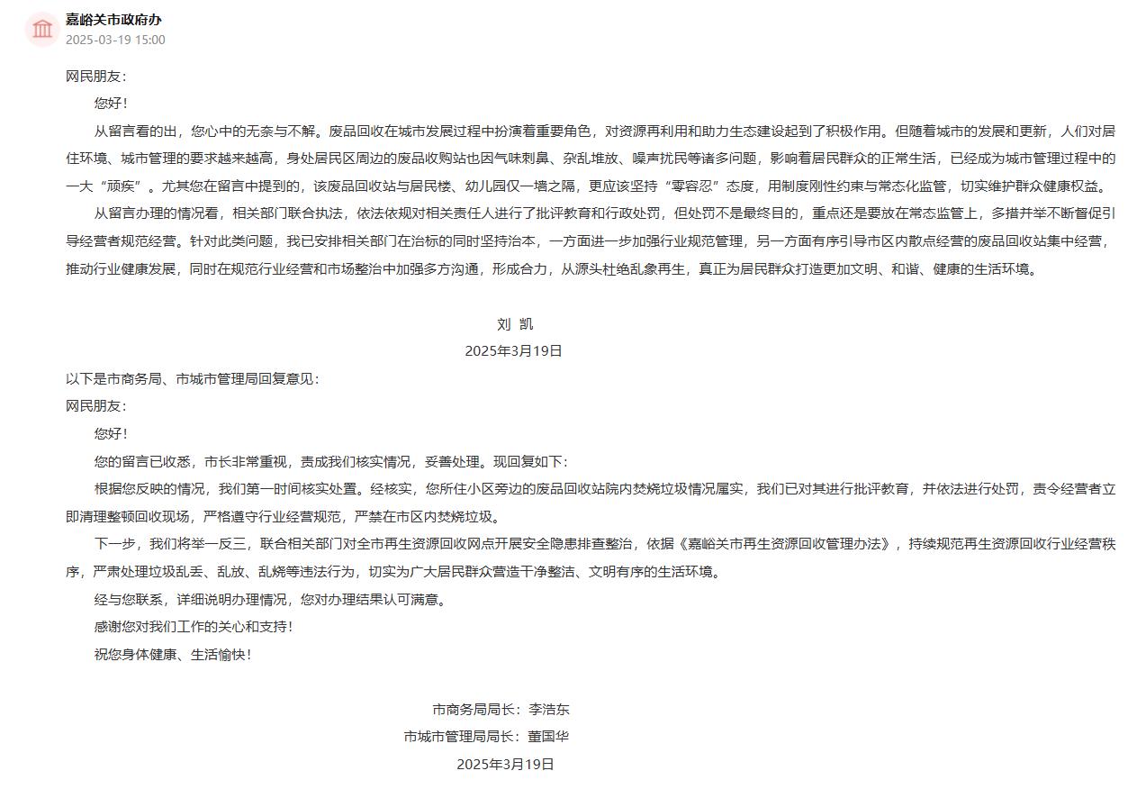 針對該留言,嘉峪關市委副書記、市長劉凱也作出回復:“廢品回收在城市發展過程中扮演著重要角色,對資源再利用和助力生態建設起到了積極作用。但隨著城市的發展和更新,人們對居住環境、城市管理的要求越來越高,身處居民區周邊的廢品收購站也因氣味刺鼻、雜亂堆放、噪聲擾民等諸多問題,影響著居民群眾的正常生活,已經成為城市管理過程中的一大‘頑疾’。尤其您在留言中提到的,該廢品回收站與居民樓、幼兒園僅一墻之隔,更應該堅持‘零容忍’態度,用制度剛性約束與常態化監管,切實維護群眾健康權益。從留言辦理的情況看,相關部門聯合執法,依法依規對相關責任人進行了批評教育和行政處罰,但處罰不是最終目的,重點還是要放在常態監管上,多措并舉不斷督促引導經營者規范經營。針對此類問題,相關部門在治標的同時堅持治本,一方面進一步加強行業規范管理,另一方面有序引導市區內散點經營的廢品回收站集中經營,推動行業健康發展,同時在規范行業經營和市場整治中加強多方溝通,形成合力,從源頭杜絕亂象再生,真正為居民群眾打造更加文明、和諧、健康的生活環境?!?nbsp;