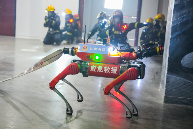 水炮機器狗內攻偵查、滅火。甘肅消防供圖