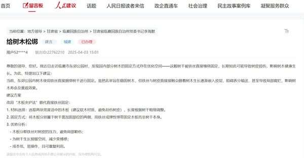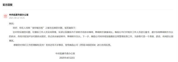 臨夏市委辦公室在回復中表示,經東郊公園景區工作人員實地查看,園內個別樹木被鐵絲纏繞,影響樹木健康成長。目前,負責管理該景區的臨夏楓臨文化旅游投資有限責任公司已安排工作人員拆除了影響樹木生長的鐵絲,并充分吸收網友建議,對需要加固的樹木改用木板加護法固定,確保樹木健康生長。