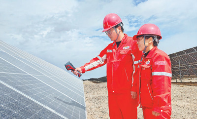 甘肅玉門,祁連山下,戈壁灘上,深藍色的光伏面板鋪展綿延。兩人多高的面板旁,一個紅色身影穿梭其間、不時停駐。他是田玉鑫,中國石油玉門油田新能源電站運維工程師,正手拿熱成像儀,給幾塊重點面板做“體檢”。