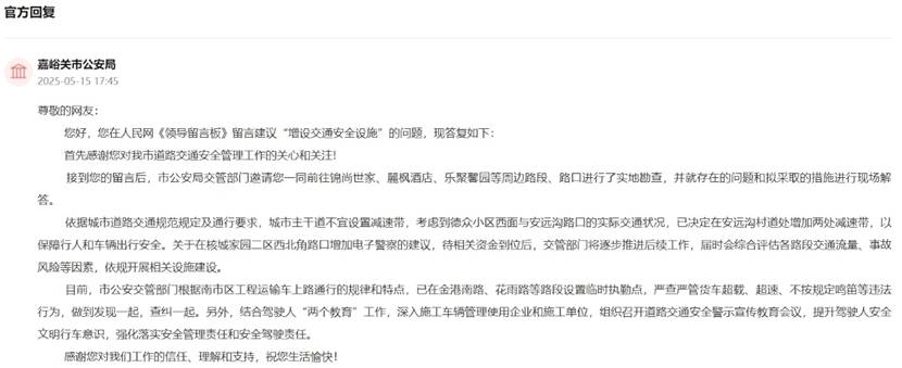 關于核城家園二區西北角路口增設電子警察的建議?,嘉峪關市公安局交管部門回應稱,將?優先綜合評估該路段交通流量、事故風險等因素?,待資金到位后依規推進設施建設。