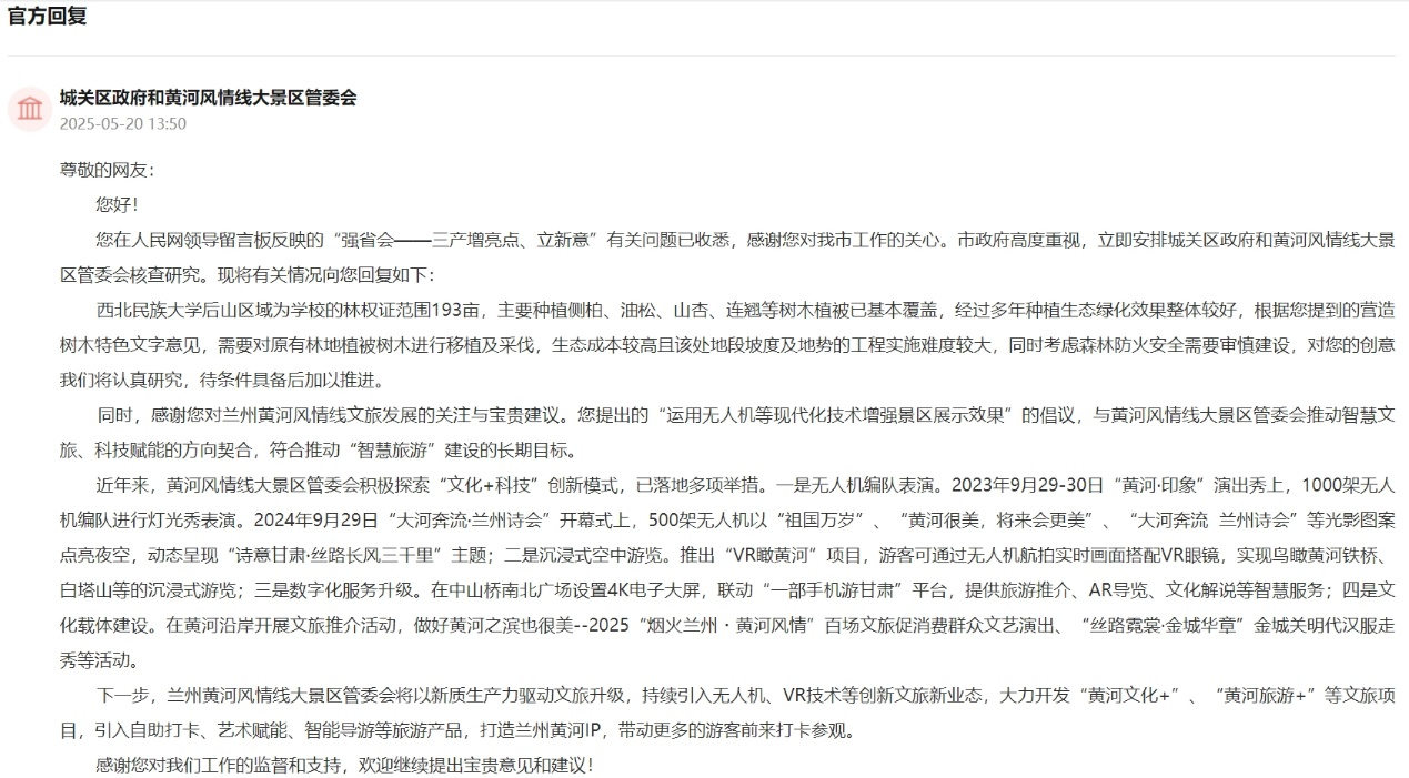 “您提出的‘運用無人機等現代化技術增強景區展示效果’的倡議,與黃河風情線大景區管委會推動智慧文旅、科技賦能的方向契合,符合‘智慧旅游’建設的長期目標?!笔盏搅粞院?,蘭州市政府高度重視,立即安排城關區政府和黃河風情線大景區管委會核查研究,并在回復中表示,近年來,黃河風情線大景區管委會積極探索“文化+科技”創新模式,已落地多項舉措。