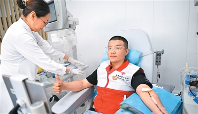 日前,一名紅十字會志愿者在天津市血液中心獻血。