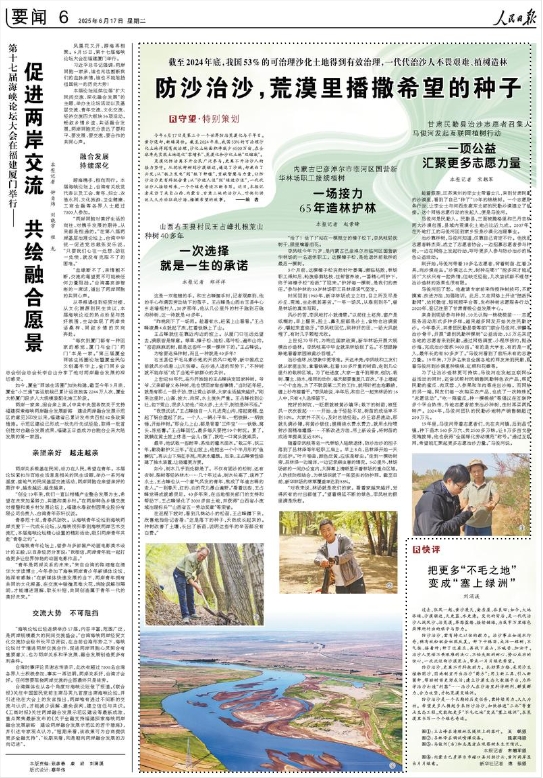 荒漠化防治離不開全民廣泛參與,更離不開治沙人的接力堅守。從挖坑種樹到沙漠鎖邊,逼退了沙線,卻熬白了頭發;從“板上發電”到“板下種植”,貢獻智慧與力量,讓防沙治沙更有科技含量;從“沙進人退”到“綠進沙退”,一代代治沙人接續傳承,一個個綠色奇跡不斷書寫。近日,本報記者采訪了來自山西、內蒙古、甘肅三地的治沙人,聽他們講述久久為功征戰沙海、播撒希望的故事。