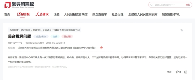 “晚上戲曲愛好者們唱秦腔、唱小曲,音響聲太大,吵得孩子沒法靜下來學習?!苯?,有網友在人民網“領導留言板”反映甘肅省天水市秦州區玉泉鎮秦州大道郊區交警大隊西側有夜間噪音擾民問題,期望有關部門能夠盡快解決。