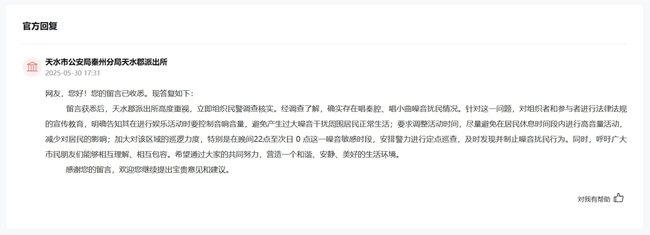 收到網友留言后,天水市公安局秦州分局天水郡派出所高度重視,立即組織民警開展調查。經核實,該區域確存在網友所指噪音問題。派出所隨即對相關活動的組織者及參與者開展法治教育,明確要求其控制音響音量,避免噪音擾民;同時調整活動時間,避開居民休息時段進行高音量活動。天水郡派出所表示,將加大對該區域的巡邏力度,特別在22:00—24:00噪音敏感時段,安排警力定點巡查,做到及時發現、及時制止。同時,呼吁廣大市民相互理解、包容,共同營造和諧美好的生活環境。