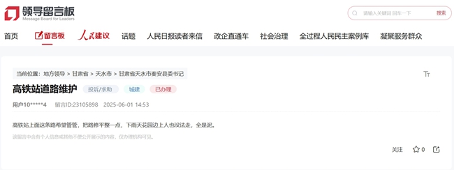 近日,有網友通過“人民網領導留言板”反映天水市秦安縣高鐵站附近路段道路泥濘影響行人出行。