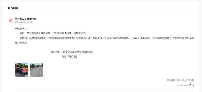 收到留言后,秦安縣委辦公室高度重視,立即組織核查并積極回復:經查,網友反映的路段因降雨導致排水設施堵塞,造成路面積水、泥濘。秦安縣委辦公室協調安排秦安縣榮秦服務管理有限公司工作人員對堵塞管網進行了疏通,并加設排水系統,提升該路段排水能力。今后如遇雨天將組織保潔人員對積水進行及時清掃。