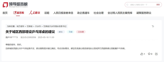 “城區西部公共乒乓球設施不足,建議在高速公路連接線處的公園或其它城區西部新建公園中配置乒乓球桌?!比涨?,天水市清水縣網友通過“人民網領導留言板”建議完善城區西部的健身設施,滿足群眾鍛煉需求。