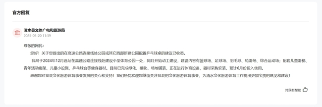 收到留言后,清水縣文體廣電和旅游局回應稱,該局已于2024年12月在高速公路連接線處選址并動工建設一處小型體育公園。公園建設內容包括籃球場、足球場、羽毛球場、輪滑場、綜合運動場等場地,并配套兒童滑梯、青年活動廊架、乒乓球臺等健身器材。目前,項目已完成綠化、硬化及場地鋪裝工作,正在進行體育設備與器材的采購安裝,預計今年6月投入使用。